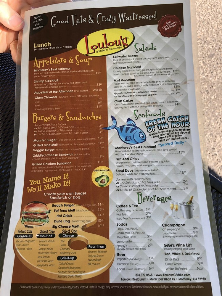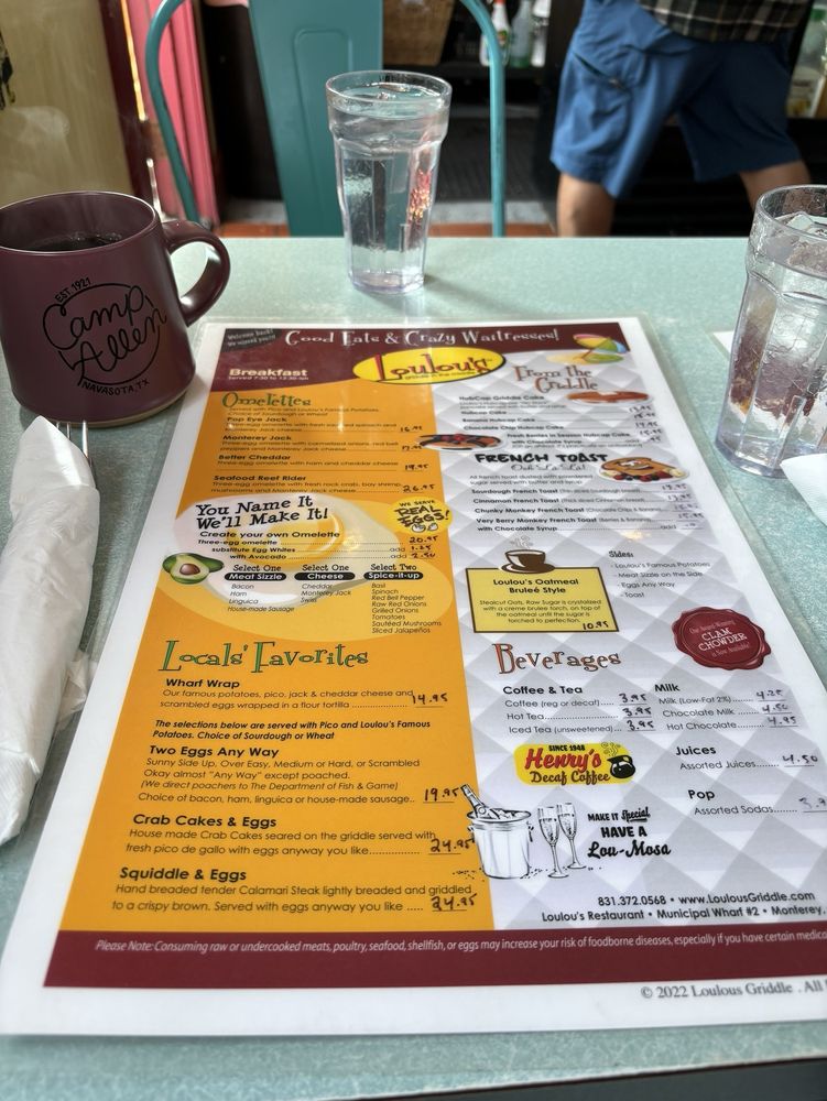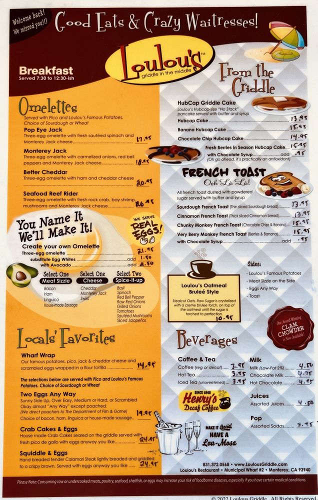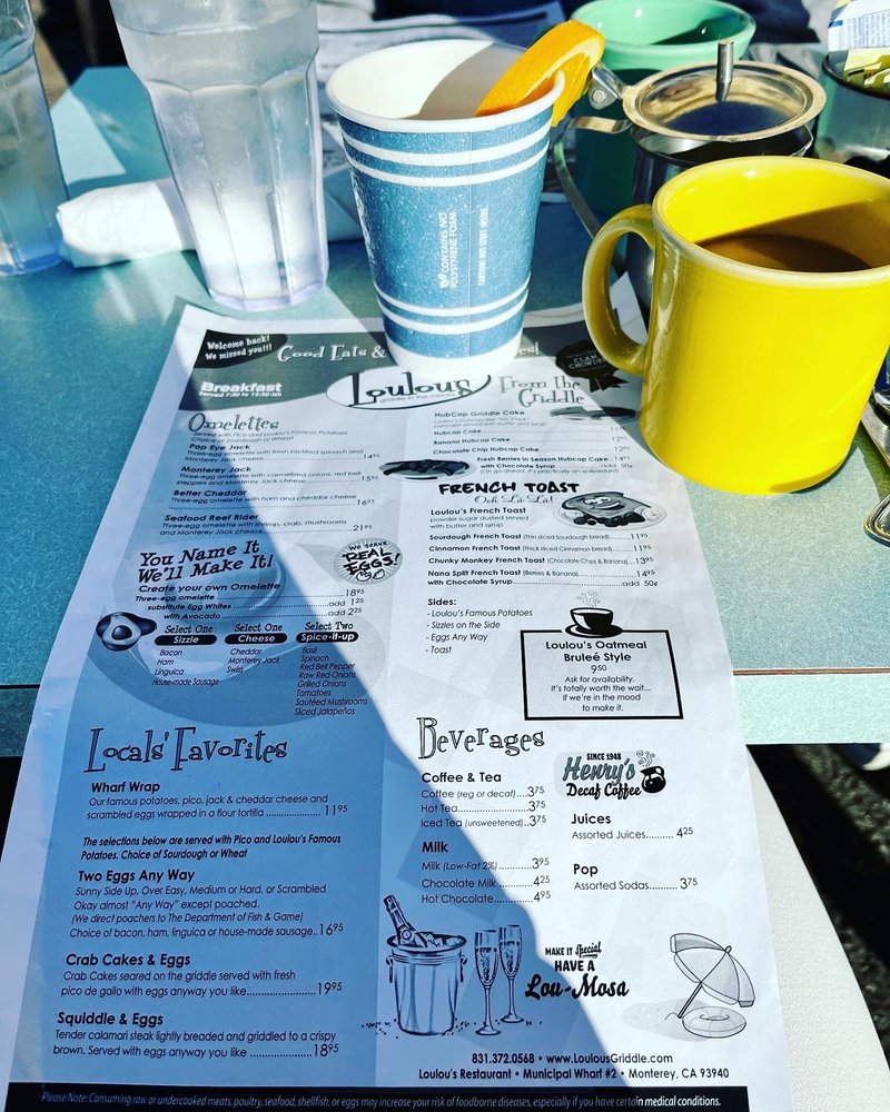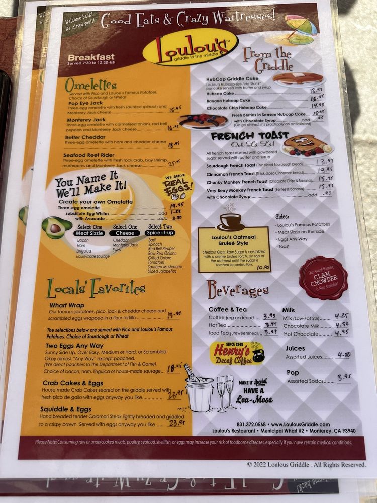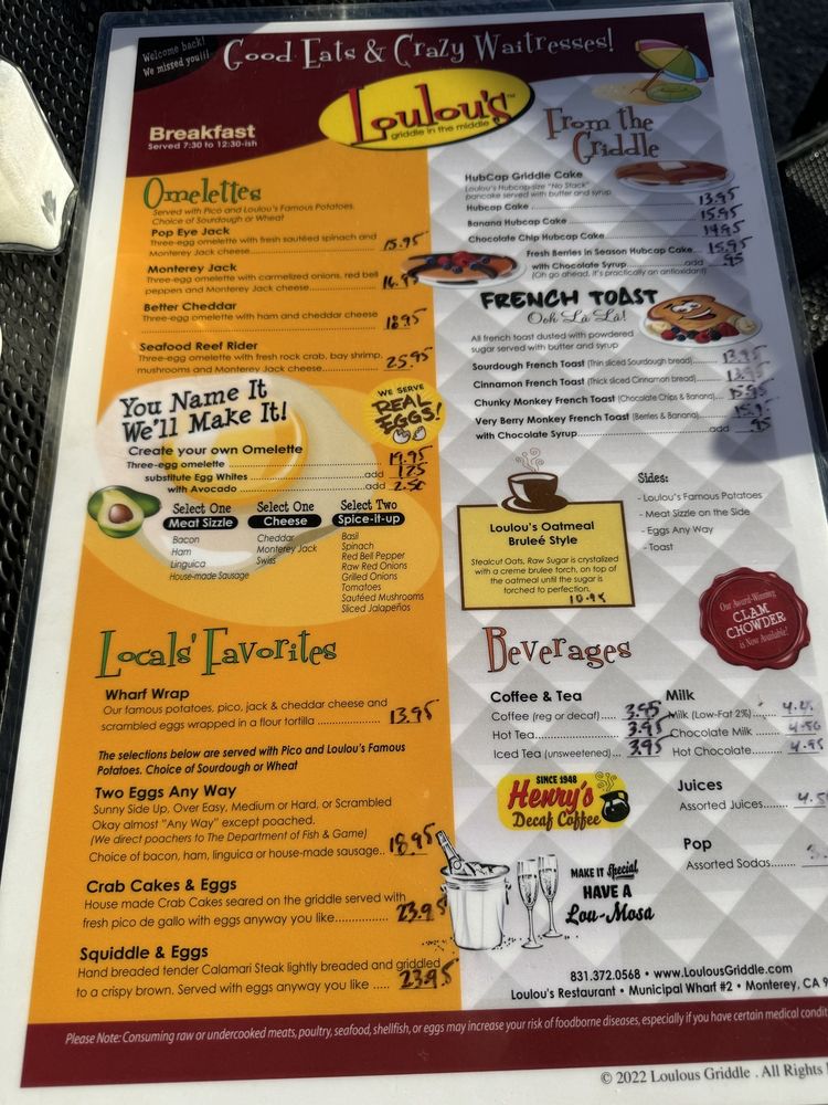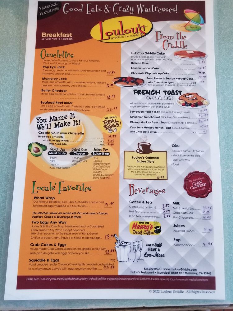 "Loulou’s Griddle In the Middle" is a charming American breakfast and brunch spot located on Municipal Wharf 2 in Monterey, CA. With a casual atmosphere, it offers a variety of vegetarian options and caters to large groups. Customers rave about the delicious food, friendly staff, and stunning ocean views. The menu features specialties like a 3 egg scramble with unique ingredients like chicken apple sausage and avocado slices, creating a filling and flavorful start to the day. The pancakes come highly recommended, with options like the chocolate chip hub cap cakes, which are a delightful treat. Loulou’s Griddle In the Middle stands out for its attentive service, cozy diner vibes, and unbeatable clam chowder. Don't miss out on this hidden gem for a memorable dining experience in Monterey.